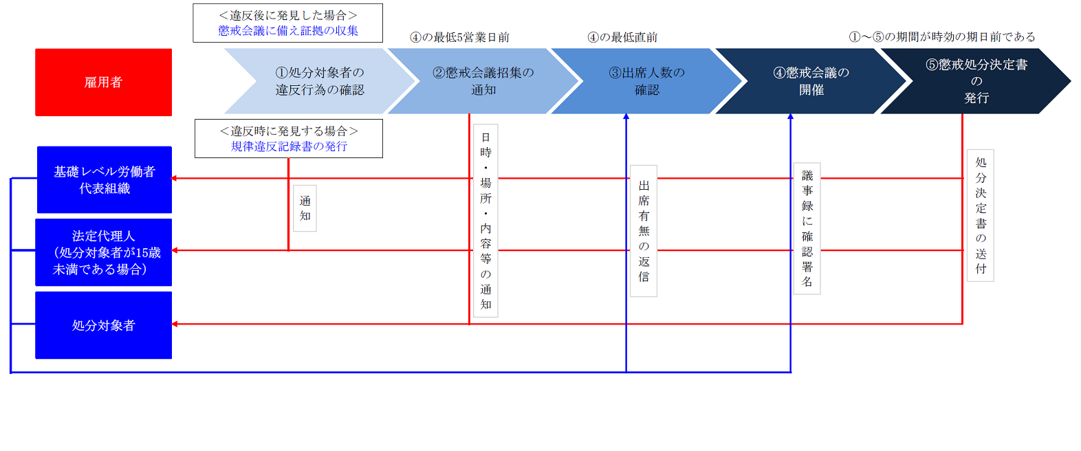 ・懲戒会議の開催日の最低5営業日前に、雇用者は、「処分対象者」、「法定代理人」(処分対象者が15歳未満である場合)と「処分対象者が構成員である基礎レベルの労働者代表組織」に通知します。 ・必須通知内容は懲戒会議の内容・日時・場所、処分対象者の氏名・違反行為です。